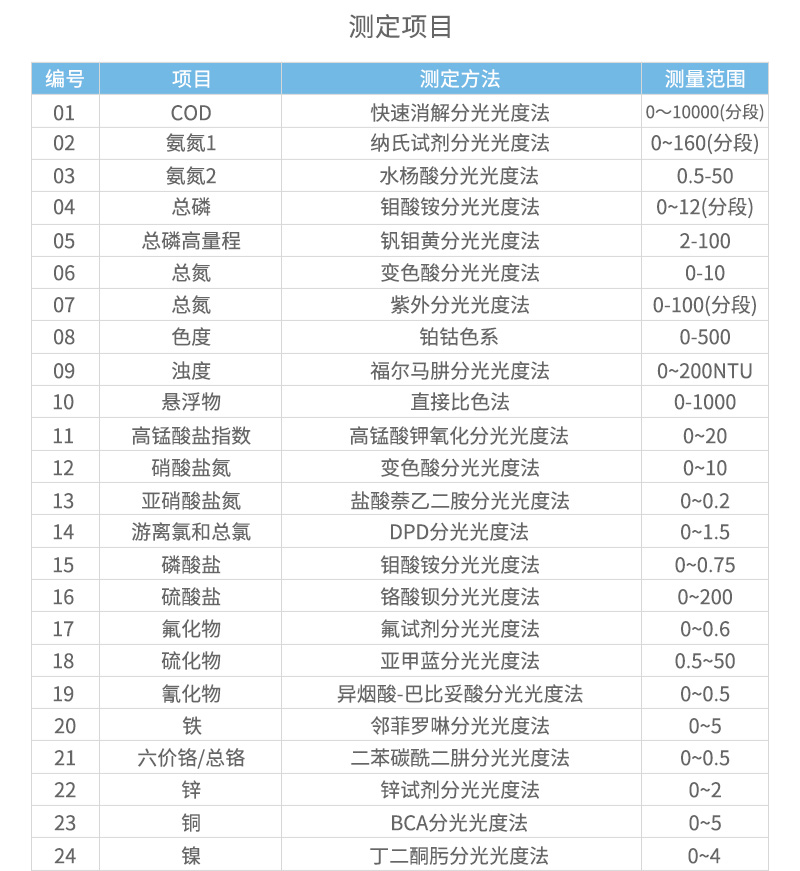 LH-3BA(V12)水質測定儀內置了48種預先編程設置好方法的曲線,其中26種可直讀濃度,包括COD、重金屬和營養鹽等參數。
